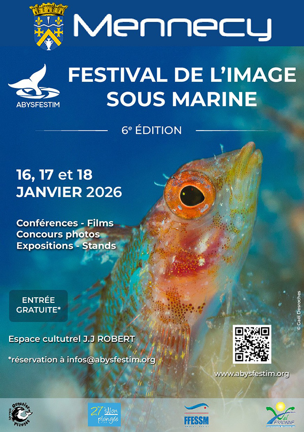Du 16 au 18 janvier 2026 je serai présent à l’ABYSFESTIM à Mennecy (Essonne, 91) pour une exposition photo et une projection du film « Ce qui ce cache sous la surface » aux côtés de François Sarano, Steven Weinberg, Vincent Maran, Jean-François Barthod, Christophe Kazmierski, Laurent Marie, Steven Surina… Entrée gratuite. Plus d’informations sur le site du Festival : https://www.abysfestim.org/