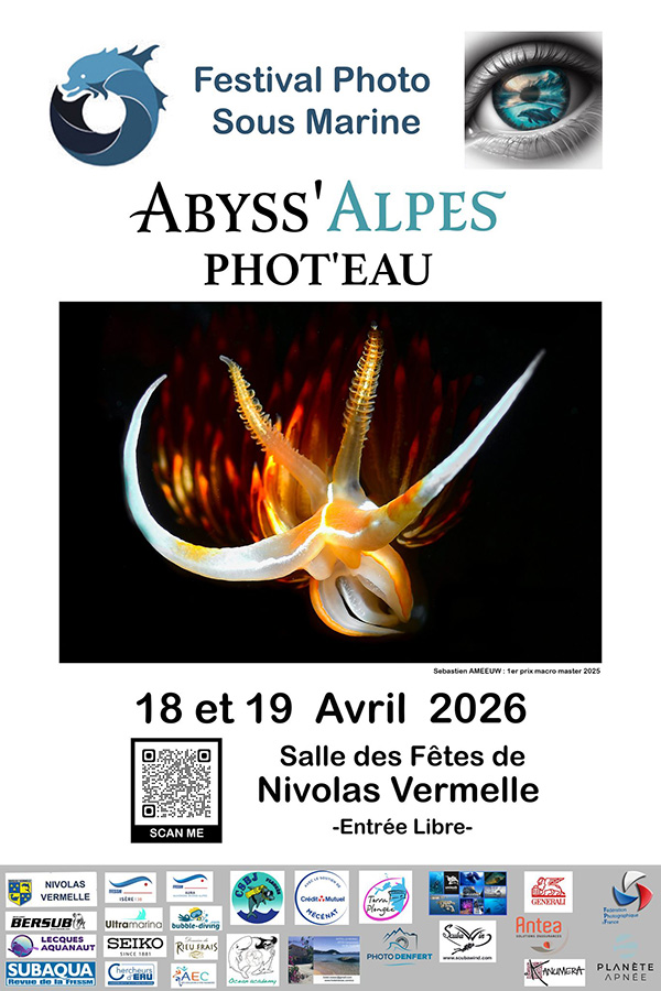Les 18 et 19 avril 2026, à Nivolas-Vermelle (Isère, 38) je serai présent au Festival photos de plongée « ABYSS’ALPES PHOT’EAU » avec une exposition sur les eaux douces.